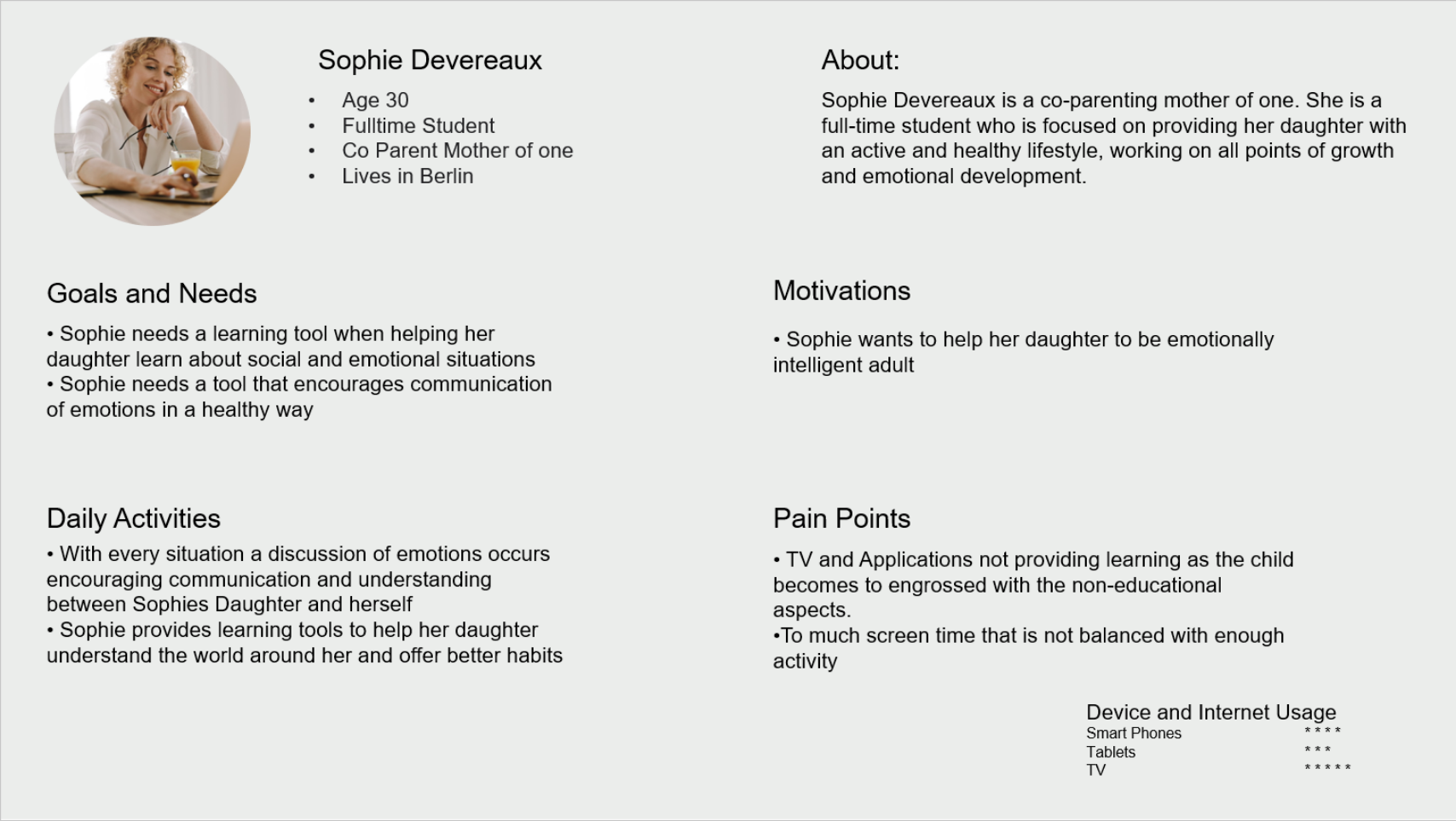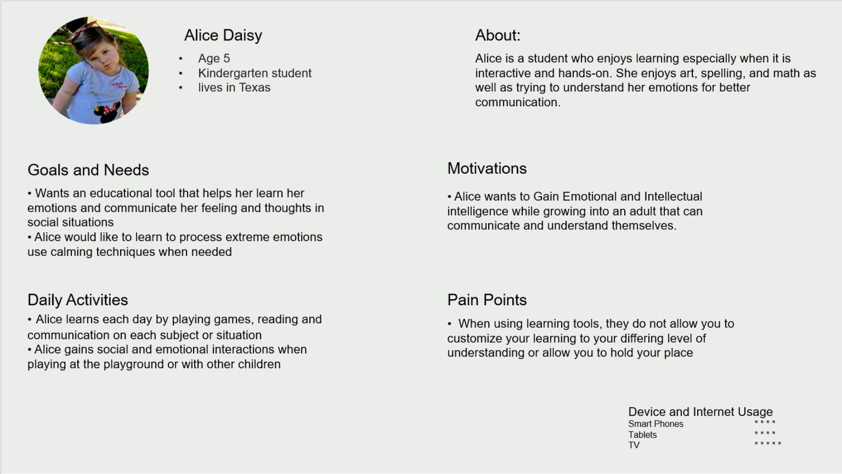 Parents and teachers need an application to help children between the ages of 2-5 understand emotion through relatability and interaction to better communicate how they are feeling. We will know this to be true when the child is having an emotional experience and they are able to communicate this to the parent or teacher to get the needed affirmation.
